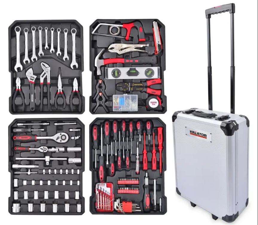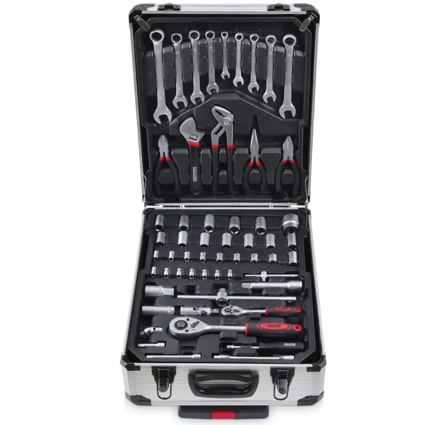 O Mala de ferramentas profissional 326 peças é um prático e luxuoso estojo de ferramentas de alumínio sobre rodas.